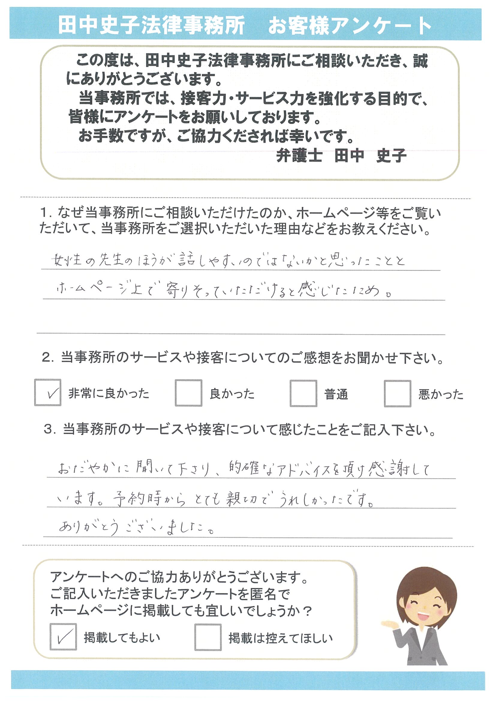 グーグルの口コミを見て、評判がすごく高かったこと、また女性の弁護士さん(同性)ということもあり、ご相談させて頂きました。
